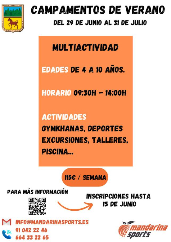 Nos ponemos en contacto con vosotros para informaros del lanzamiento del CAMPAMENTO DE VERANO en El Tiro, organizado por la empresa Mandarina Sports y que se realizará desde el 29 de junio al 31 de julio, en cinco semanas: