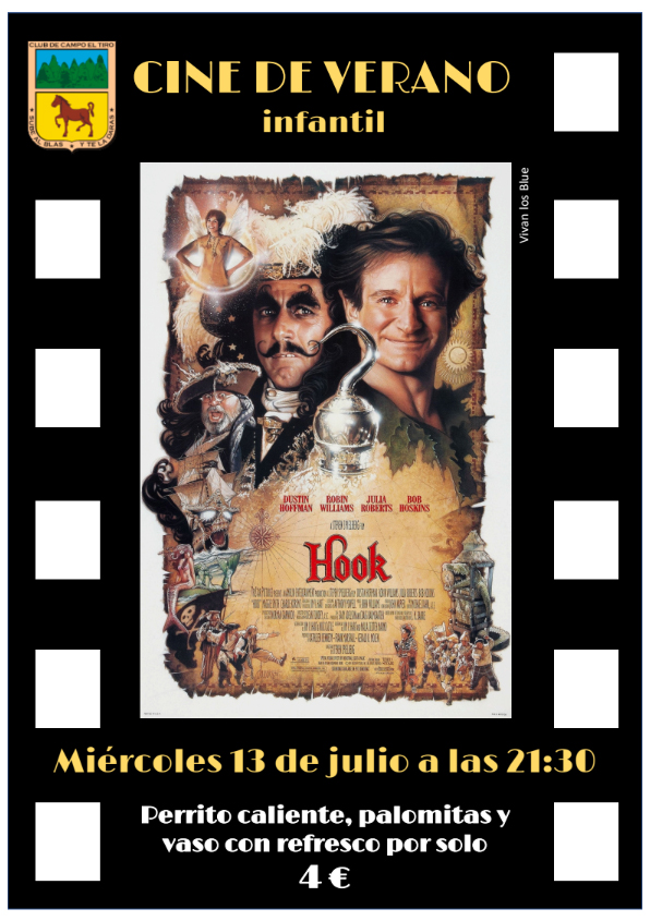 Este próximo miércoles 13 de julio a las 21:30 proyectaremos la película “Hook, el capitán garfio” en nuestro cine infantil de verano al aire libre. Dispondremos de un menú infantil acorde a la actividad y que os mostramos en el cartel adjunto. Os esperamos a toda la familia.