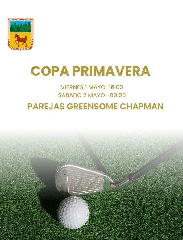 El próximo sabado 2 de mayo a las 9h( Posibilidad de viernes 1 a las 16h), celebraremos el torneo Copa Primavera, Modalidad parejas Greensome Chapman, grandes premios para primeros y segundos, bola más cercana y drive más largo.